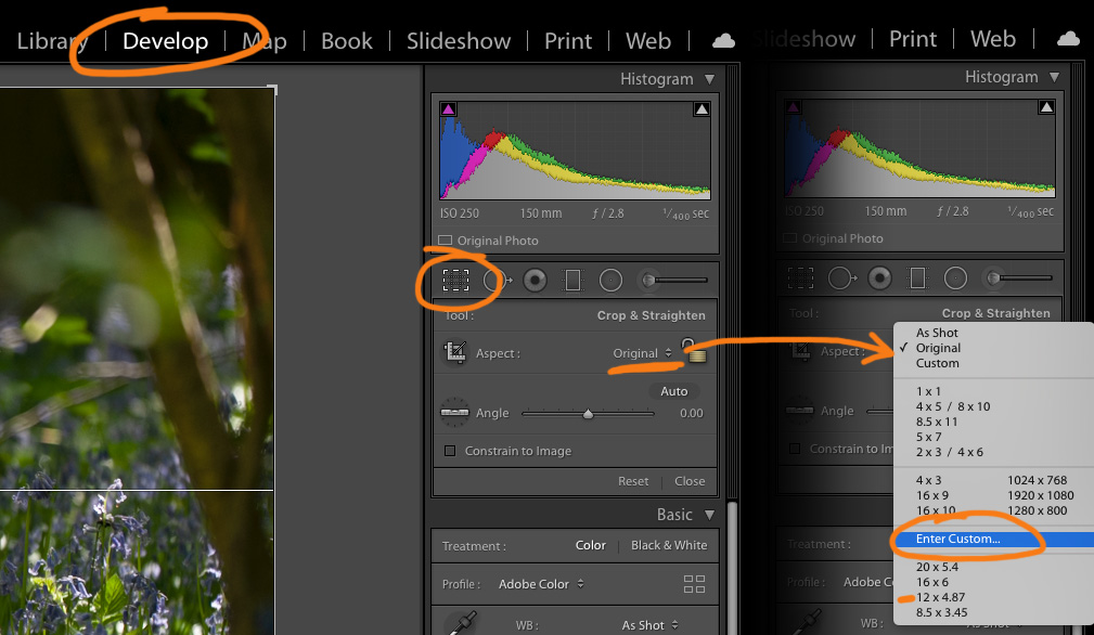 In the Develop Menu, select the ‘Crop & Straighten’ tool. There’s a drop down menu where you have the option to add a custom ratio - input 1200 x 487 (or 12 x 4.87). This will give you the correct ratio when you drag the handles of your crop window. When you're happy with the crop hit return to accept the selection.