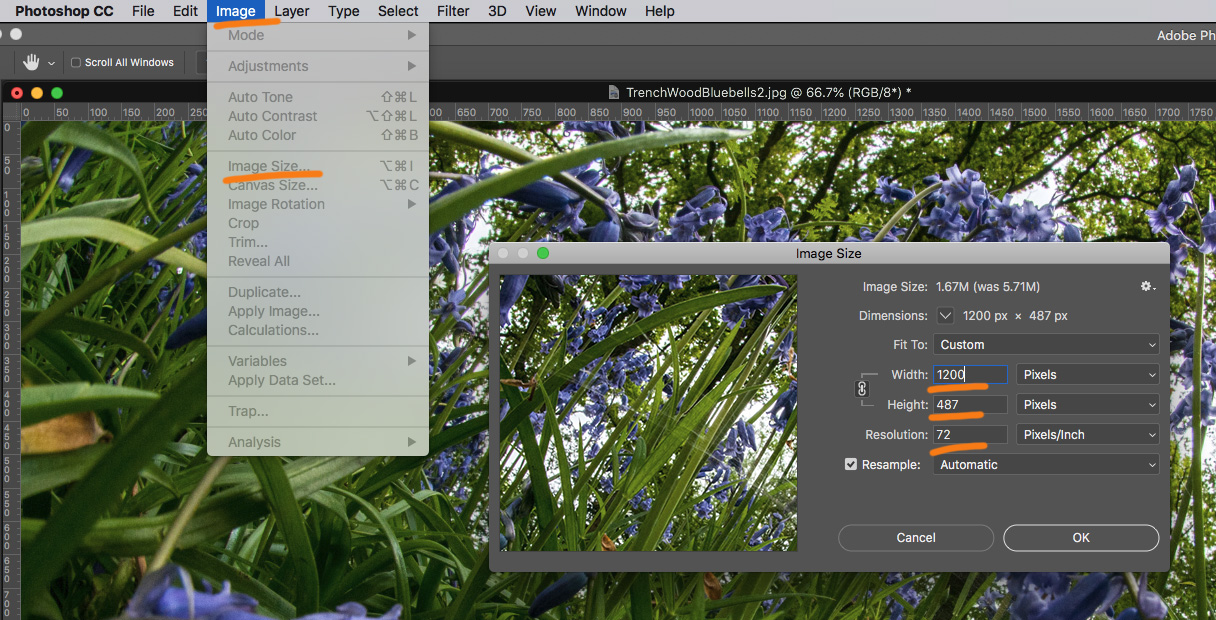 Then go to the Image menu and select Image Size. Set the image to 1200 pixels by 487 pixels and the resolution to 72dpi. Then Save as a jpeg and send to