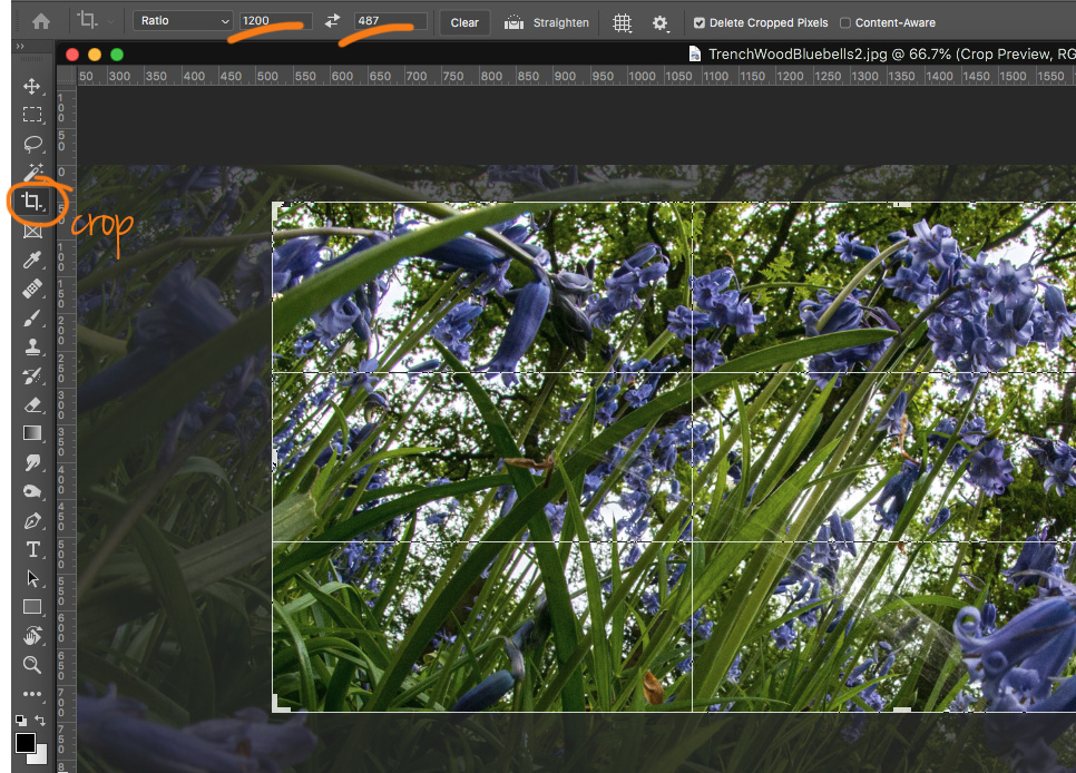 If you are using an older version of Photoshop, the options are slightly different, but the process is the same. Find the crop tool and set the ratio to 1200px x 487px.